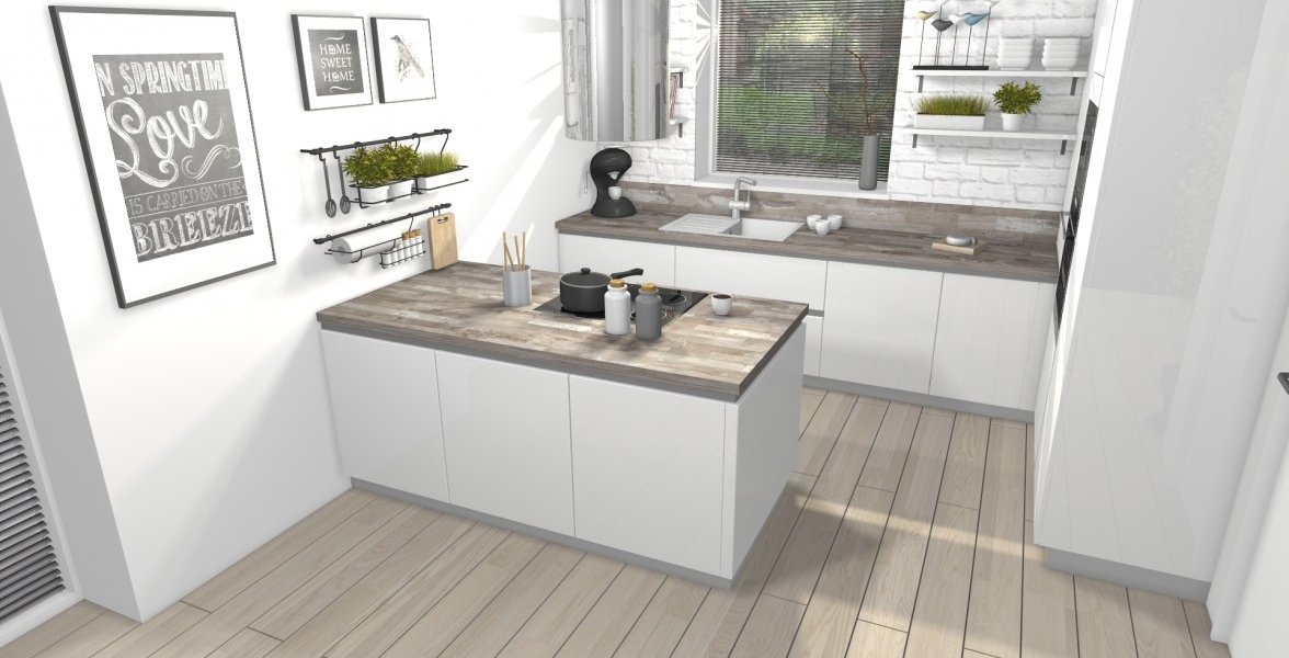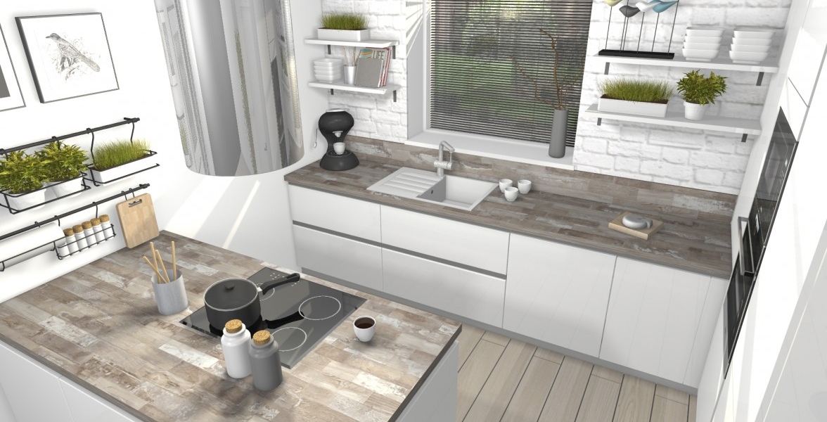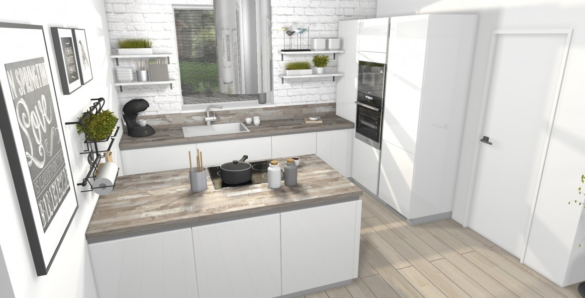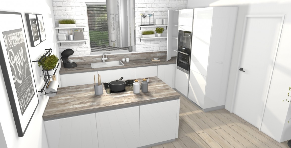 Originálna kuchynka v materiáloch biely vysokolesklý akryl v kombinácii s laminátovou pracovnou doskou v dekore starého dreva. Čisté línie zapustených úchytov, biela tehla, a voľné police nám pomohli vytvoriť moderný, ľahký, mladistvý a nadčasový dizajn. Presne to boli požiadavky klienta. Sme radi že sa nám ich podarilo vyplniť a zrealizovať. |