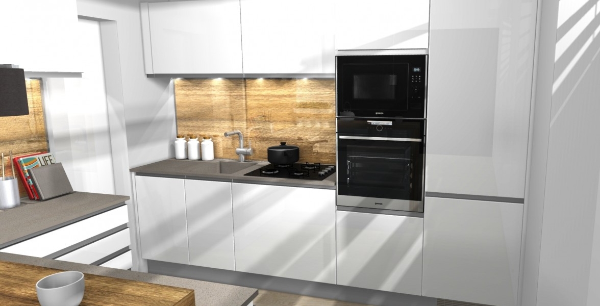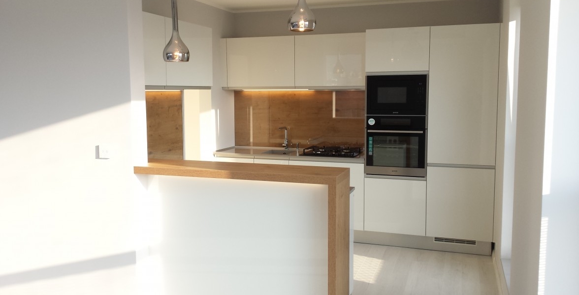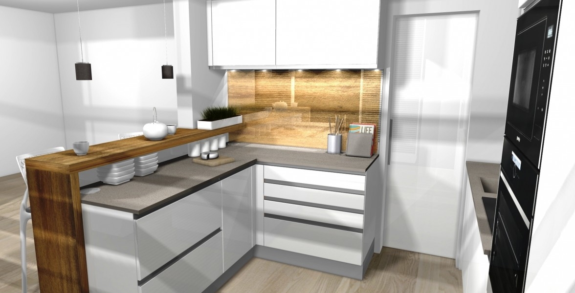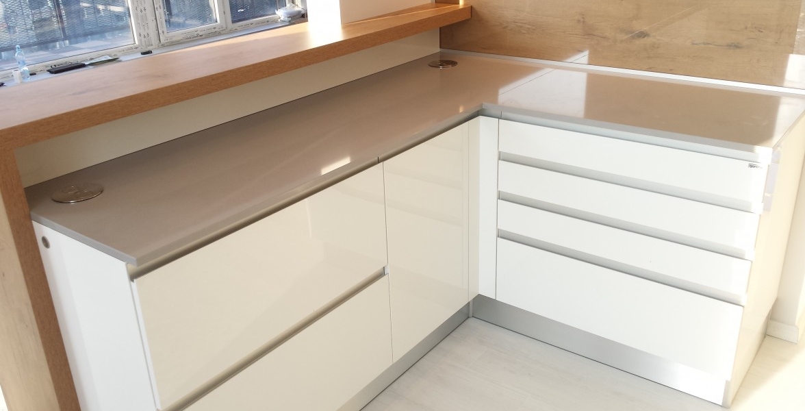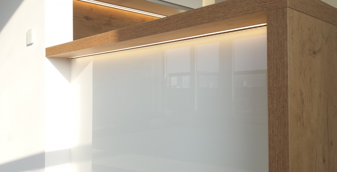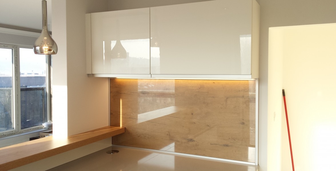 Jeden z ďalších vydarených projektov v Novej časti Bratislavy. V kuchyni je použitý "sorraya" úchyt, ktorý je zafrézovaný na hornej hrane dvierkoviny, čiže nám nič netrčí a nevadí a oku len lahodí. Ako zástena je použité lamino v odtieni dub antic, na ktorej je naložené číre kalené sklo. Pracovná doska a aj drez je z totožného materiálu Silestone - Cemento spa. Naložený bar je aj podsvietením, ktoré je zafrézované v difuzéri s mliečnym krytom pre rozptýlenie svetla. |