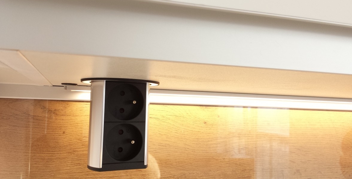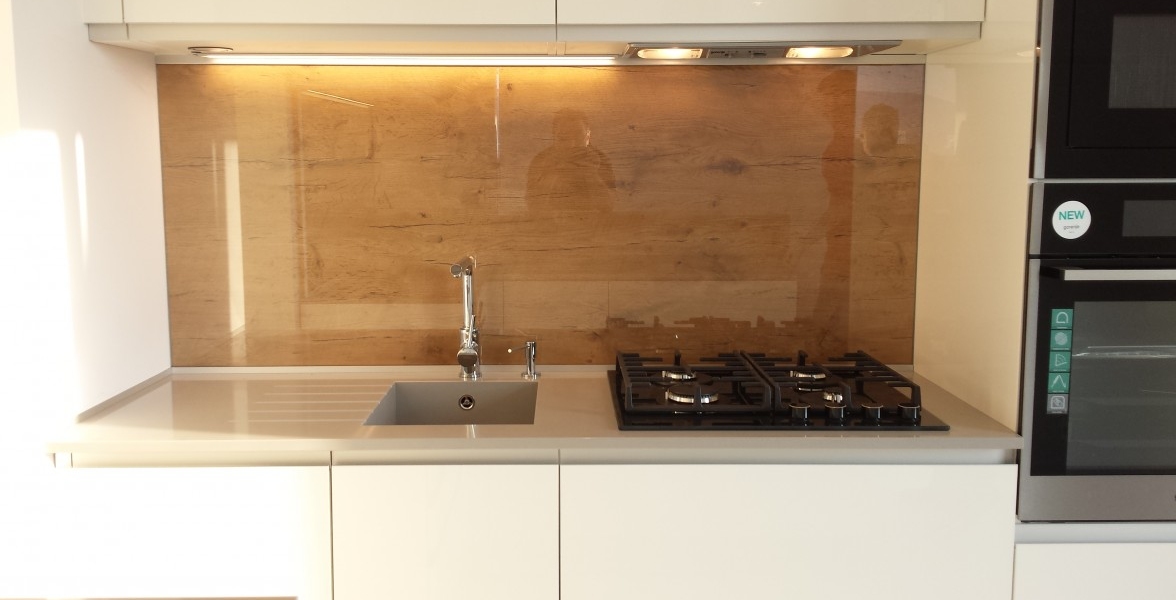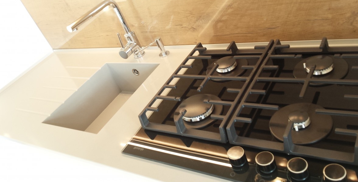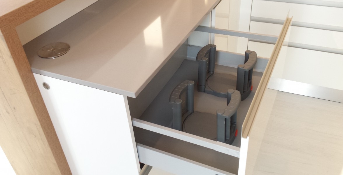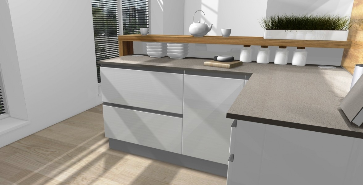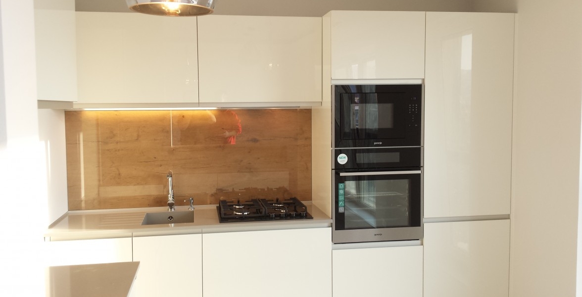 Jeden z ďalších vydarených projektov v Novej časti Bratislavy. V kuchyni je použitý "sorraya" úchyt, ktorý je zafrézovaný na hornej hrane dvierkoviny, čiže nám nič netrčí a nevadí a oku len lahodí. Ako zástena je použité lamino v odtieni dub antic, na ktorej je naložené číre kalené sklo. Pracovná doska a aj drez je z totožného materiálu Silestone - Cemento spa. Naložený bar je aj podsvietením, ktoré je zafrézované v difuzéri s mliečnym krytom pre rozptýlenie svetla. |