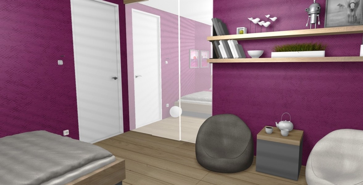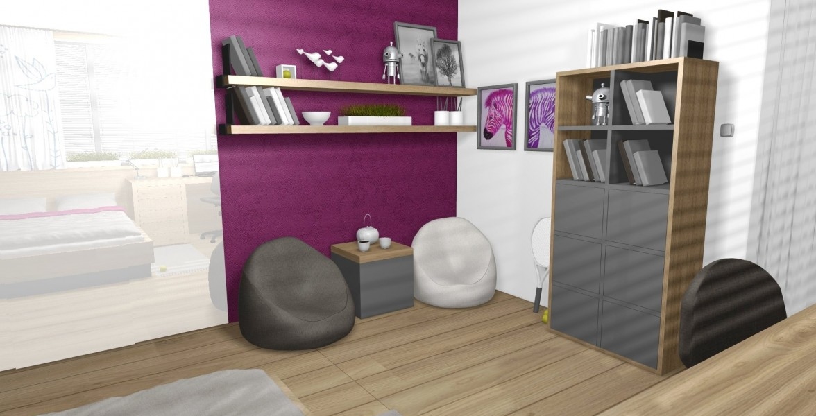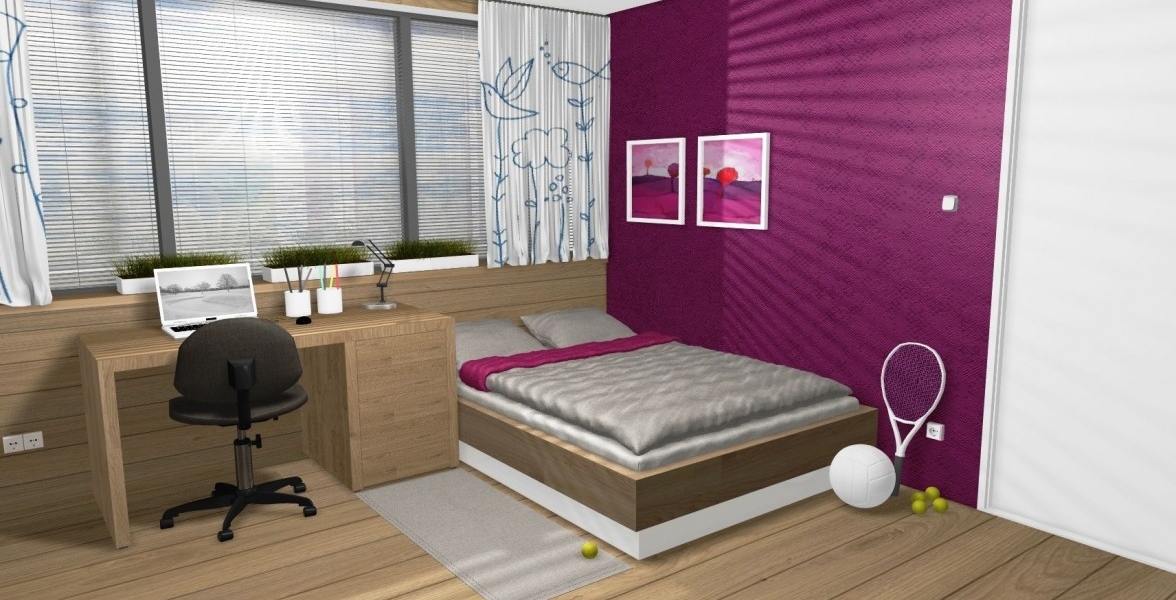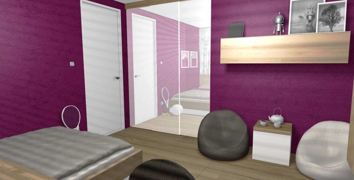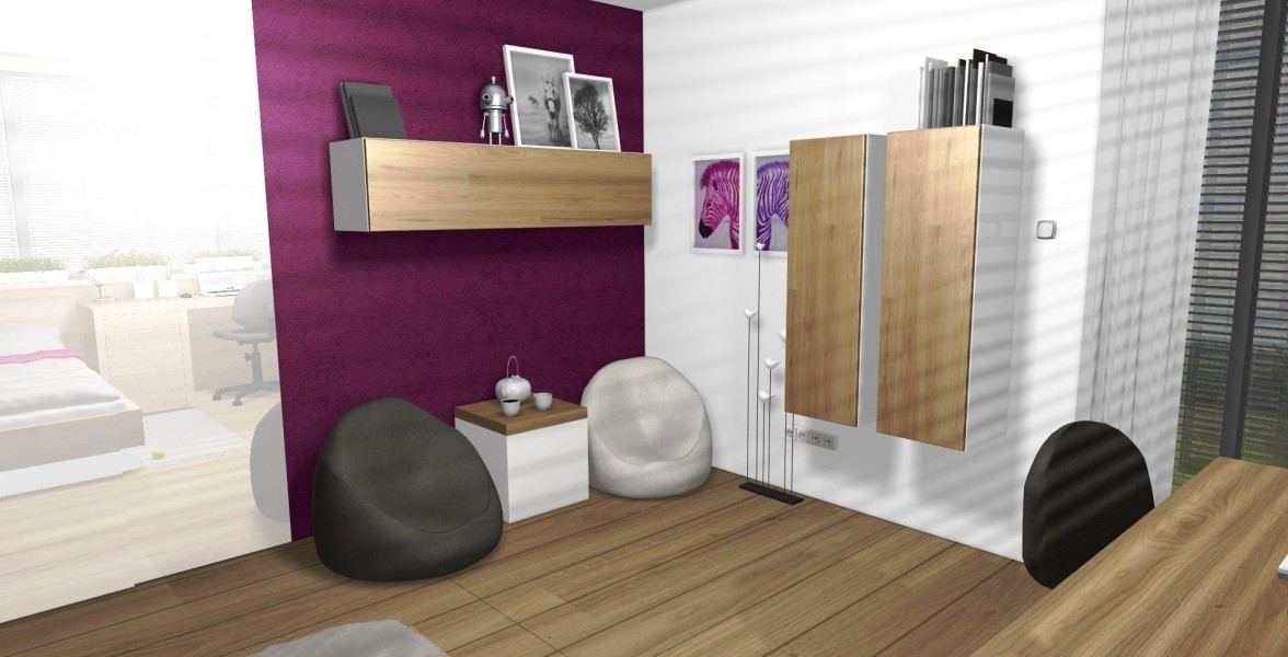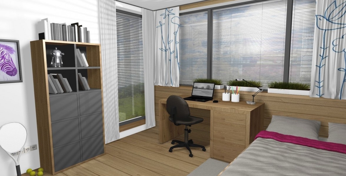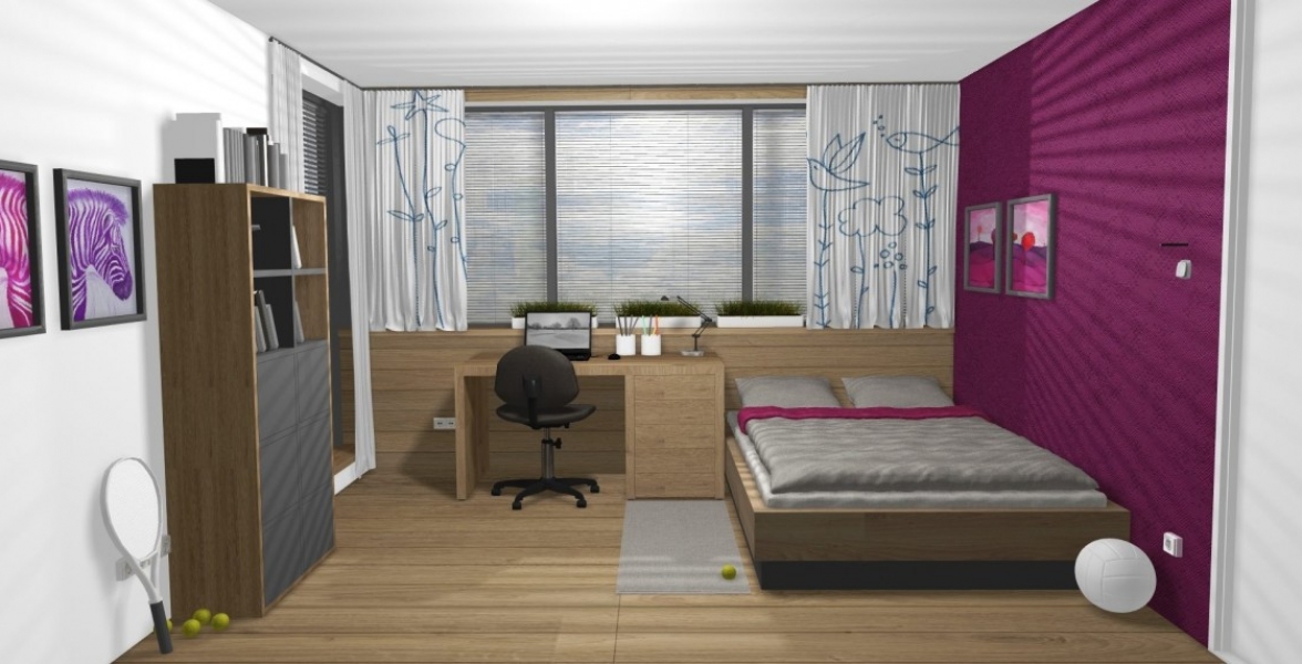 Zaujímavosťou v tejto izbe je prechádzajúca podlaha po rám okna a aj ponad okno. Teda podlaha je na zemi ale aj na jednej zo 4 stien. Izba pre Dašku pôsobí príjemne a typicky dievčensky. V izbe sa nachádza vstavaný šatník a aj kútik pre dievčenské návštevy. |