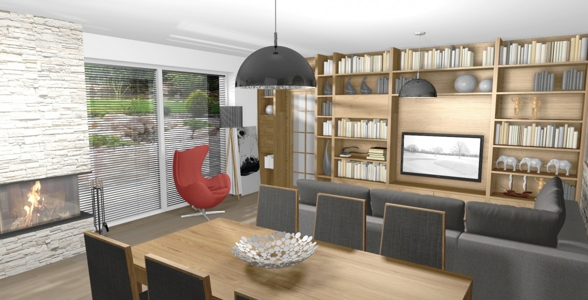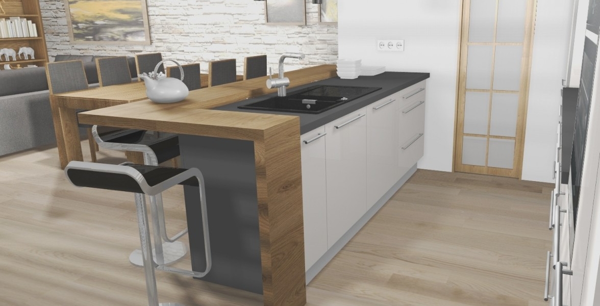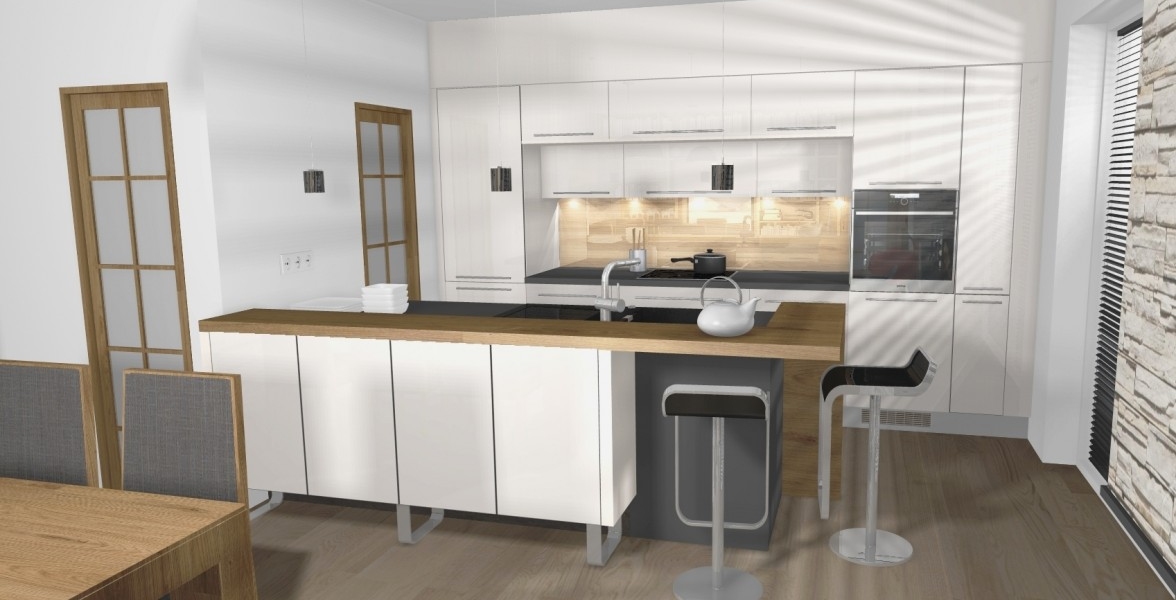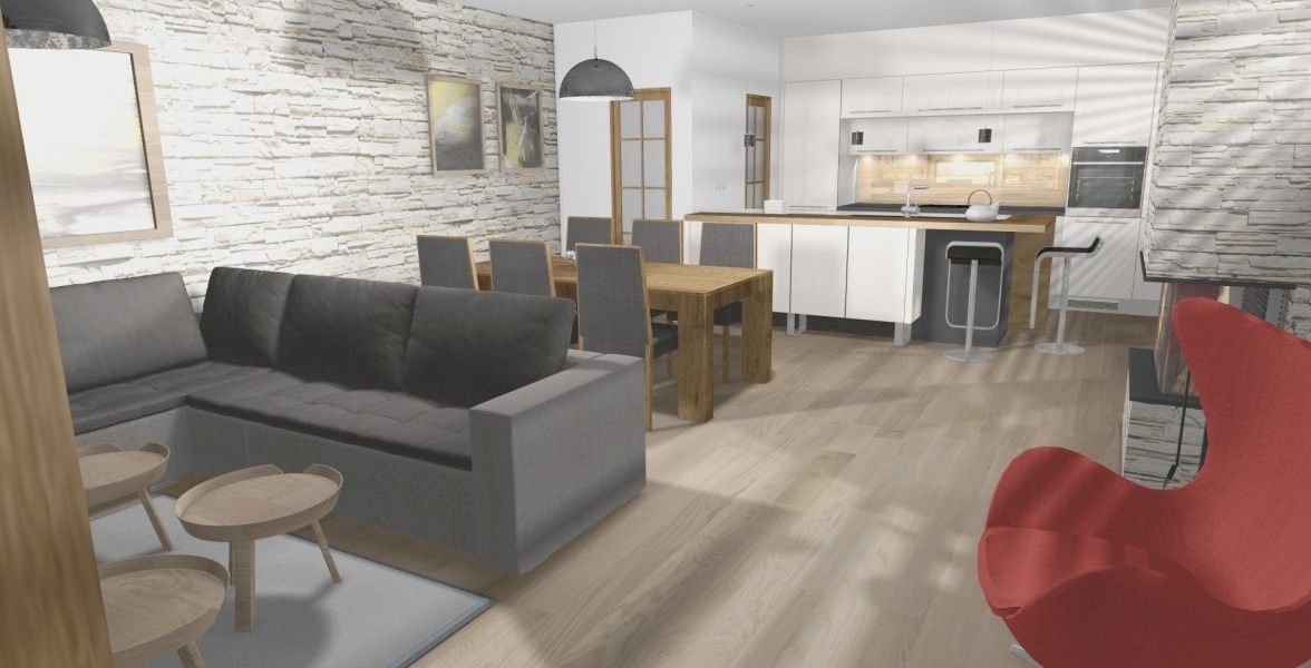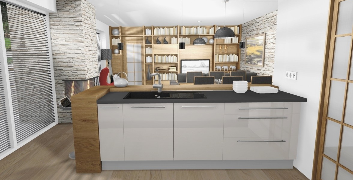 Návrh priestoru kuchyne, obývačky a jedálne sme vypracovali v dvoch rôznych variantoch, z ktorých je každý v inom štýle. Jedna verzia je viac do sterilnejšieho štýlu, teda biela, sivá, dreva pomenej. V druhej verzii je použitého viac dreva, teda celý priestor je viac preteplený a mäkkší. Klientom sa rozhodovalo ťažko, no nakoniec zvíťazil "viac drevený" projekt. |