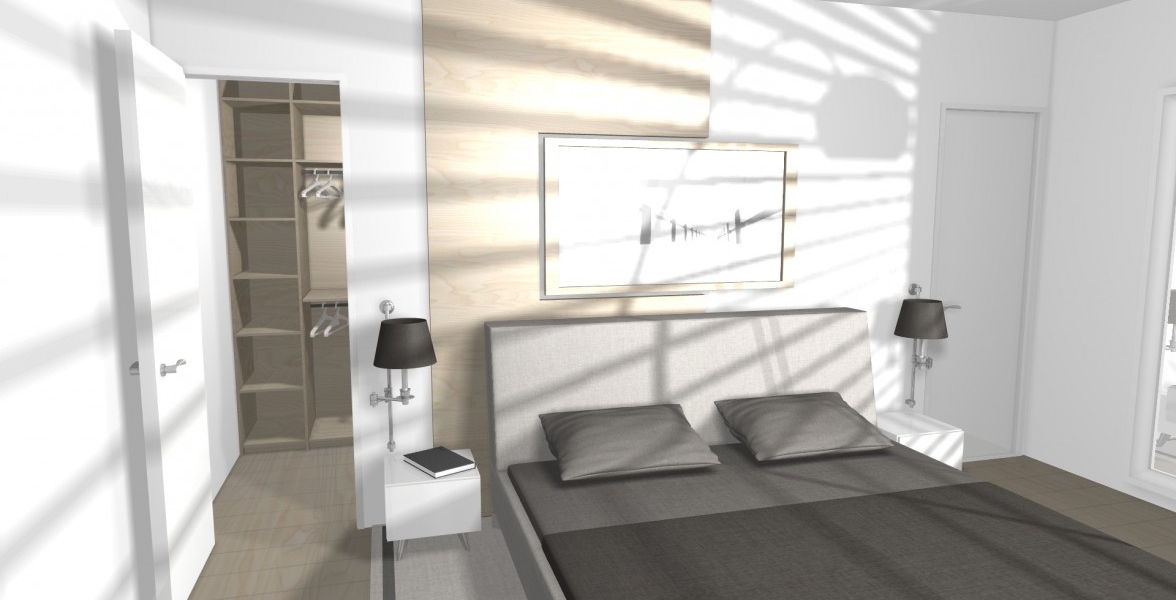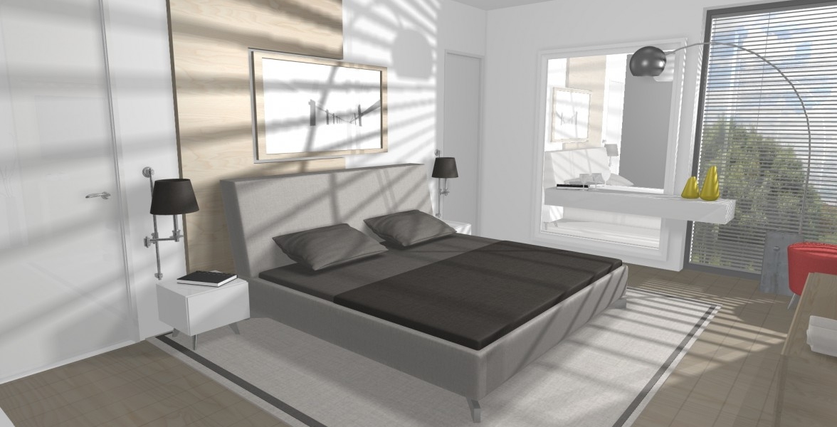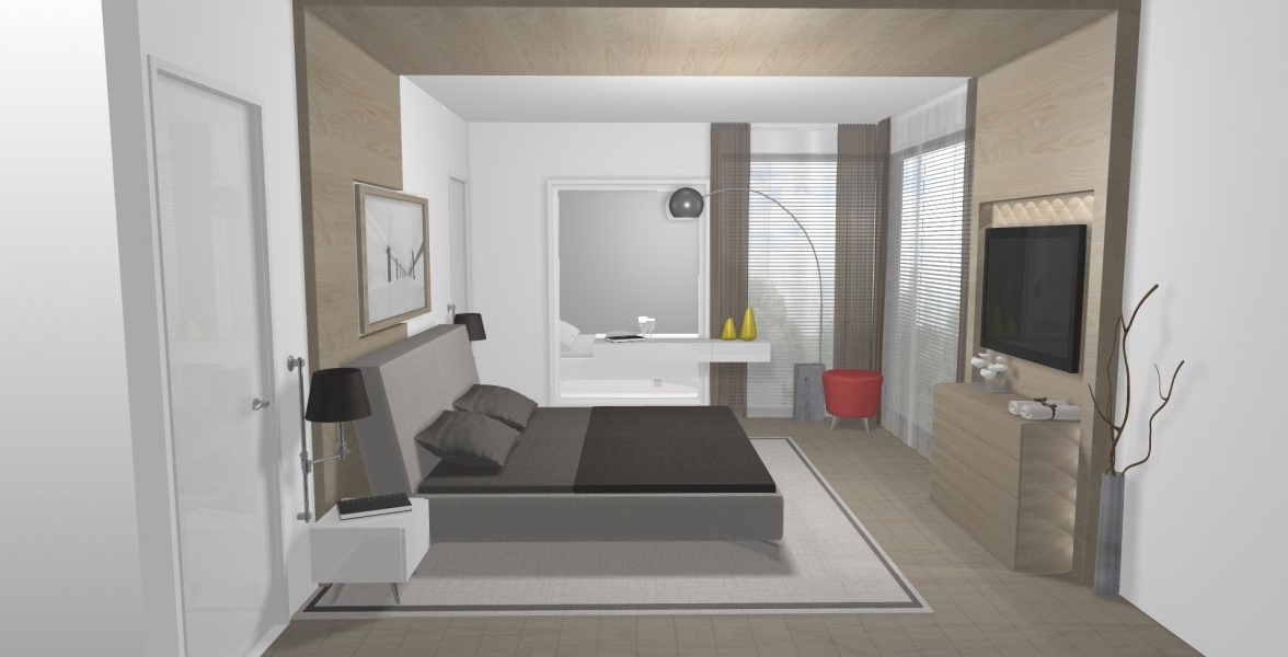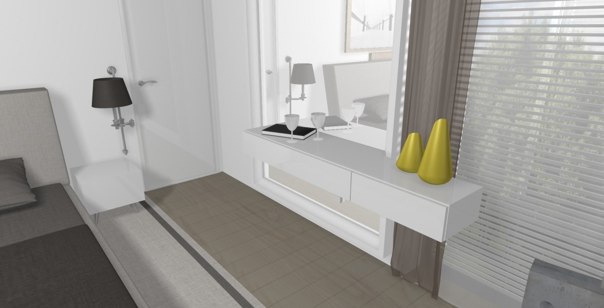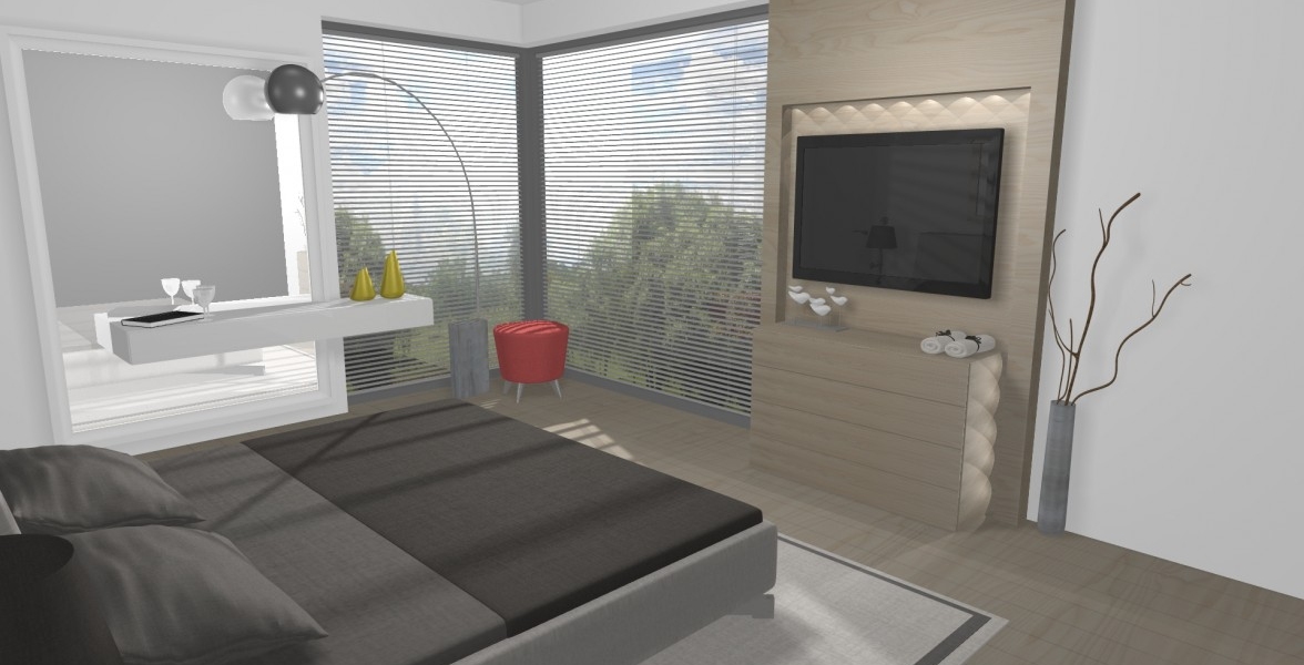 V tejto spálni je mnoho zaujímavých prvkov. Napr. dýhový panel ktorý prechádza od čela postele až na druhú protiľahlú stenu, kde je TV a komoda. Ďalším prvkom je veľké zrkadlo v ráme, v ktorom zakomponovaný stolík s taburetom na líčenie sa pre dámu, či obraz nad posteľou, ktorý je súčasťou dýhového panelu. |